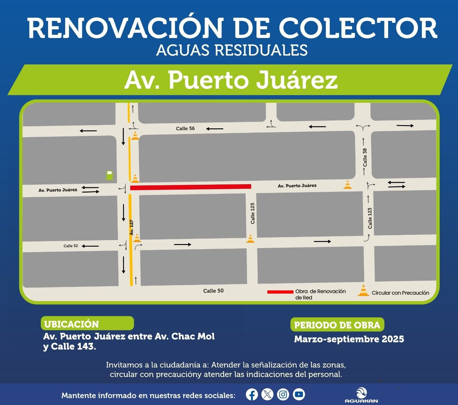 Para conocer las rutas alternas, los cierres parciales y el avance de la obra, Aguakan invita a la población a seguir sus canales oficiales en redes sociales: